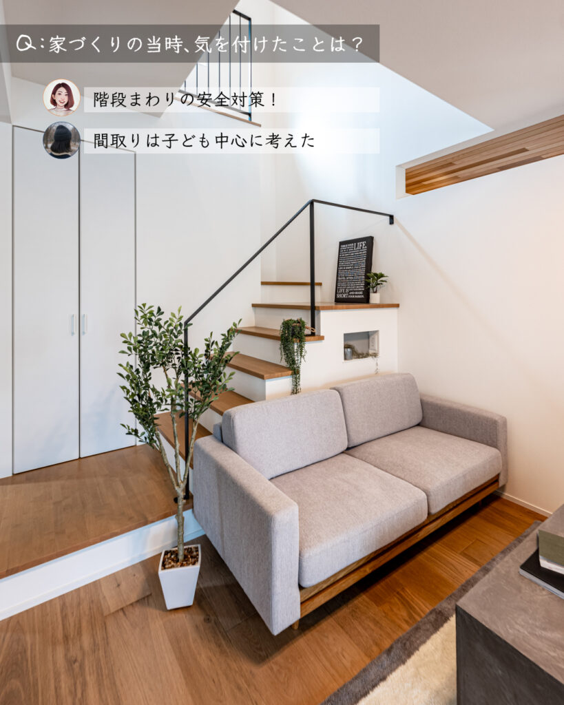 家づくりを始めた当時はまだ上の子しかいなくて、0歳でした。1歳以降の子どもにとって家の中のどんなことが危険かっていうのもあまり分かっていない時期だったので、子育て中の営業担当さんに相談しながら安全面を整えていったような覚えがあります。階段の手すりを掴みやすいものにしたり、二階の廊下の腰壁は階段に転落しないように高く…120cmくらいですかね、だいぶ高く設定しました。配慮してよかったと特別感じてないのは、まだ危ないことが起きたことがないからなのかなぁ。