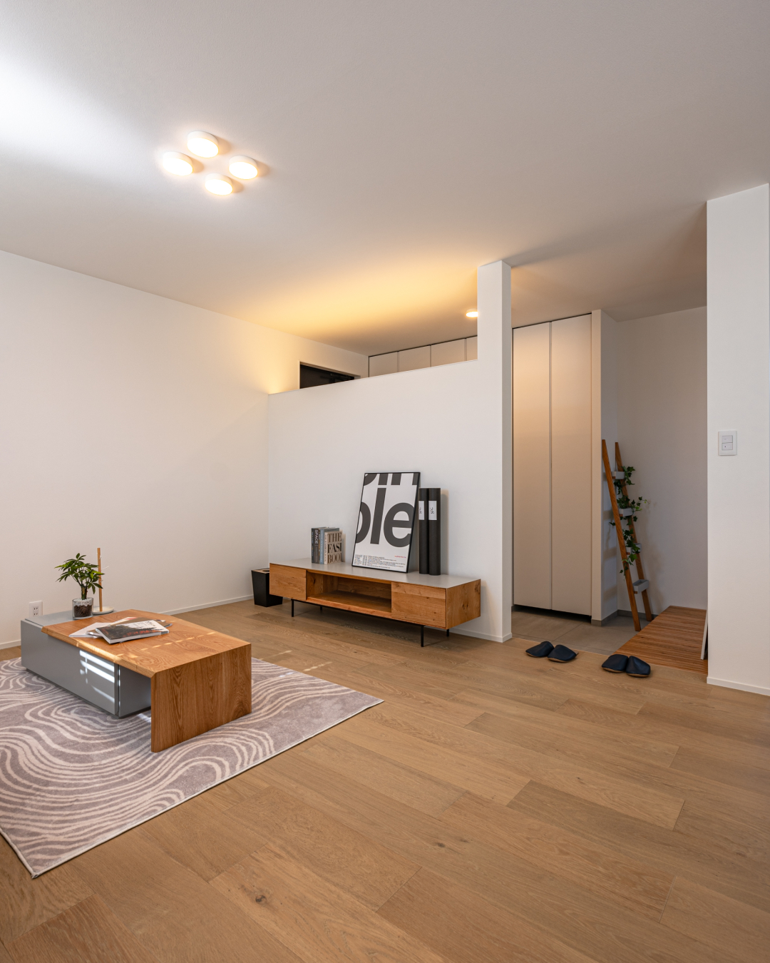 ●幅の広いオークの無垢材を使用した三層フローリングが床面を広く見せてくれる