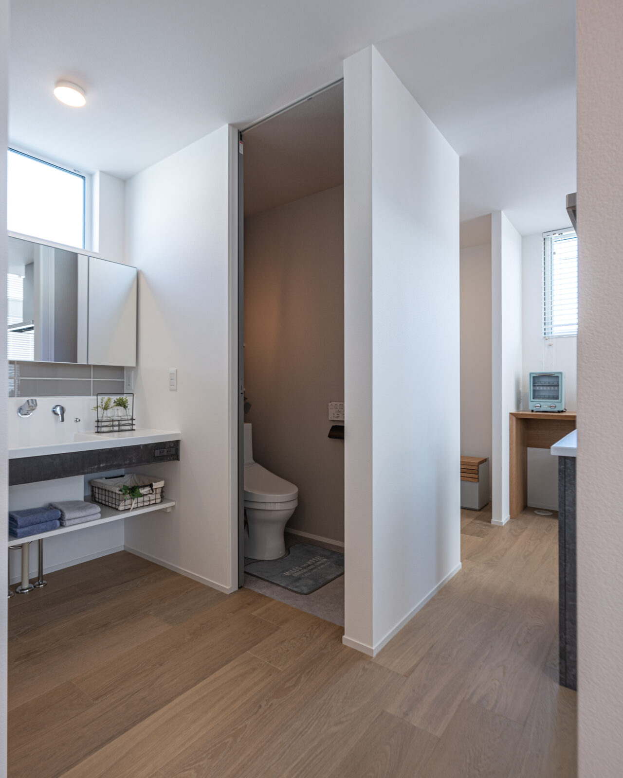 ●分かれた動線のすぐ先に独立洗面台があるので、来客も手を洗いやすい