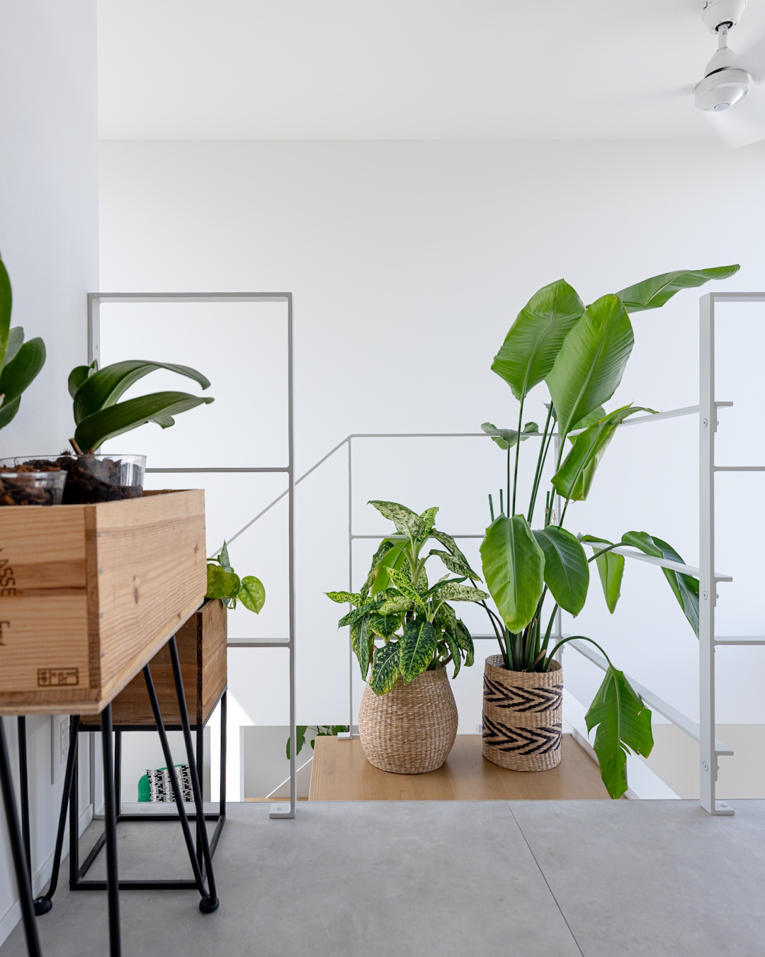 ●吹き抜けを見上げると、室内ガラス越しに二階の植物が見える